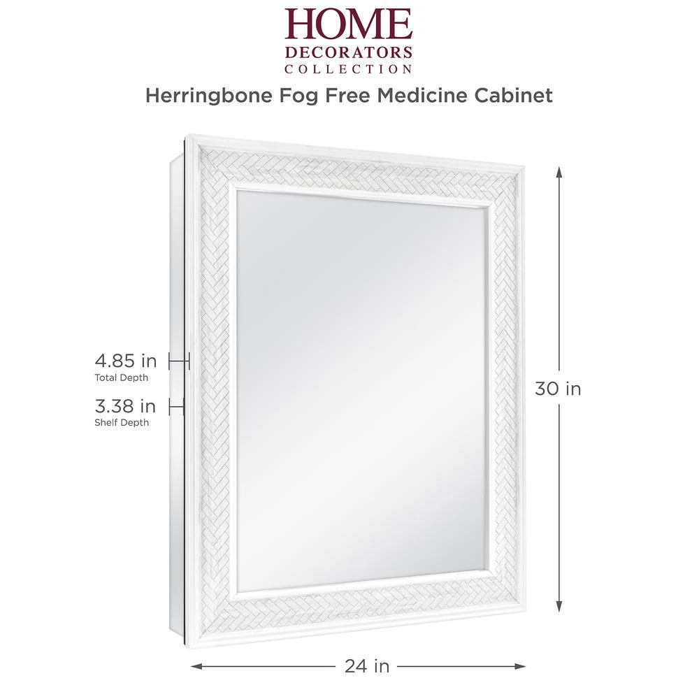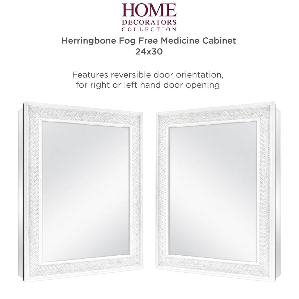 The Home Decorators Collection 24 in. W x 30 in. H x 4.85 in. D Fog Free Framed Marble Herringbone Medicine Cabinet gives you a fogless reflection you’ve always dreams of. Our innovative, fog-free technology is safe, affordable and does not require heating elements. You can finally enjoy a fog-free view after a steamy shower. This medicine cabinet can be recessed or surface mounted. Includes side mirrors and hardware for optional surface mount feature. Use the two double shelf pegs for quick and easy customized storage space along with the 3 adjustable glass shelves. Also included are 3 removable bins for even more storage that are dishwasher safe. The door opens 165° allow for optimal usage of the interior door and back mirror for multiple viewing angles for added functionality. The durable rust-free aluminum frame is exceptionally strong and the mirror is already assembled for your convenience. The EZ-cam hanging system allows you to securely install your medicine cabinet with the included hardware and hanging instructions. The versatility of this cabinet also allows the door to be reversible to open left or right based on your preference. The herringbone design can easily coordinate with any existing bathroom hardware.