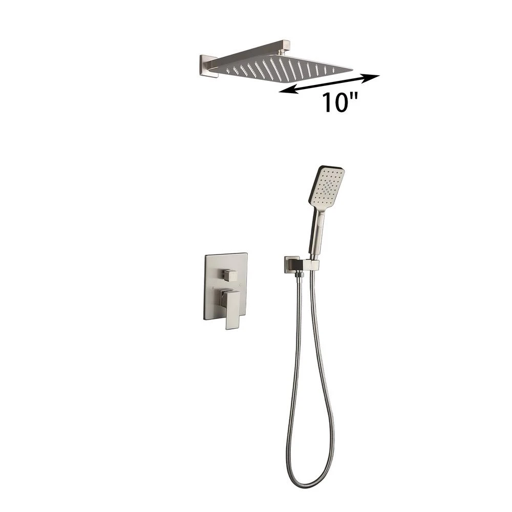 - Complete Shower System with Valve — All parts of the rain shower set are made of high-quality materials with professional technology. Those parts include 10-inch square rainfall shower head, handheld shower head, 15-inch shower arm, shower holder, pre-embedded valve, and 60-inch shower hose. The brushed nickel finish and brass combination offers anti- corrosion and classical looking.