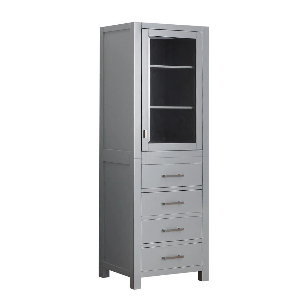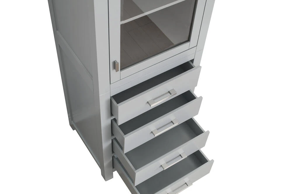 The Modero 24 in. Linen Cabinet has a simple clean design with a Chilled Gray finish and brushed nickel hardware. It is constructed of solid Poplar wood and veneer construction with soft-close doors and drawers that showcase its quality. The Linen Cabinet offers a clear glass door with interior shelves and soft-close drawers for storage.