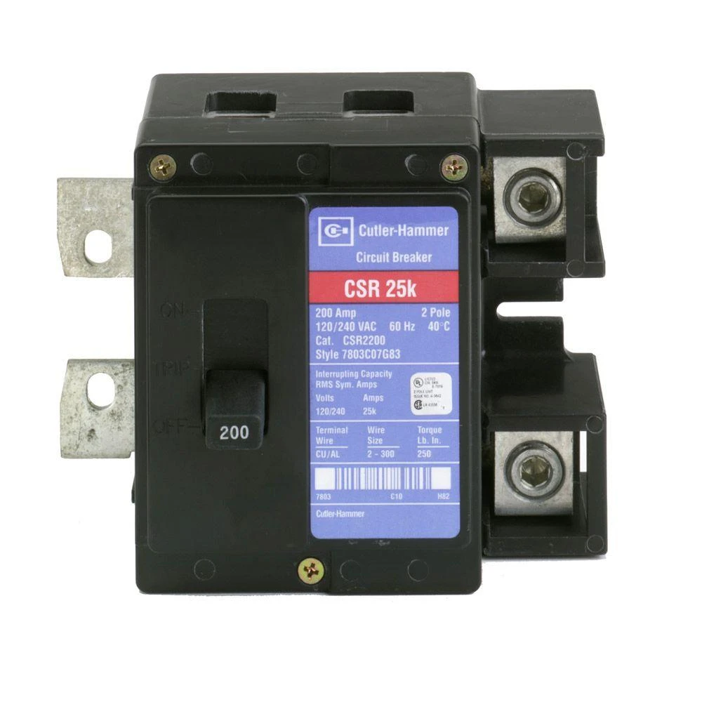 The Eaton CSR 200 Amp Double-Pole Main Breaker Kit is sized to trip before the total current draw of the panel exceeds the current carrying capacity of the feed from the electric company. This breaker is intended for use as a main breaker in a main breaker or meter breaker load center to deliver electricity to the branch circuit breakers. This unit can also be used as a service disconnect.