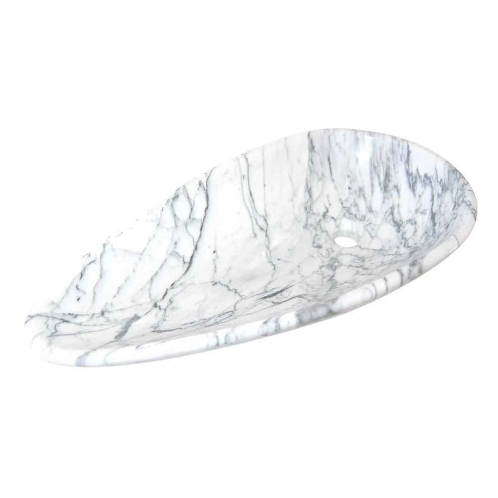 The Eden Bath Pod Shaped Above Counter, Vessel Sink is made of Polished Carrara Marble. The modern Pod stone sink features a half egg like shape that defies the laws of symmetrical design. This sink can be pointed in any direction when mounted, the faucet could flow into either end of the sink depending on what unique look you are trying to achieve. The Pod is modern art for the bathroom, true to form. This modern bathroom vessel sink is also available in honed Black Basalt. We recommend that you also purchase a drain with your stone sink in the same finish of your faucet.