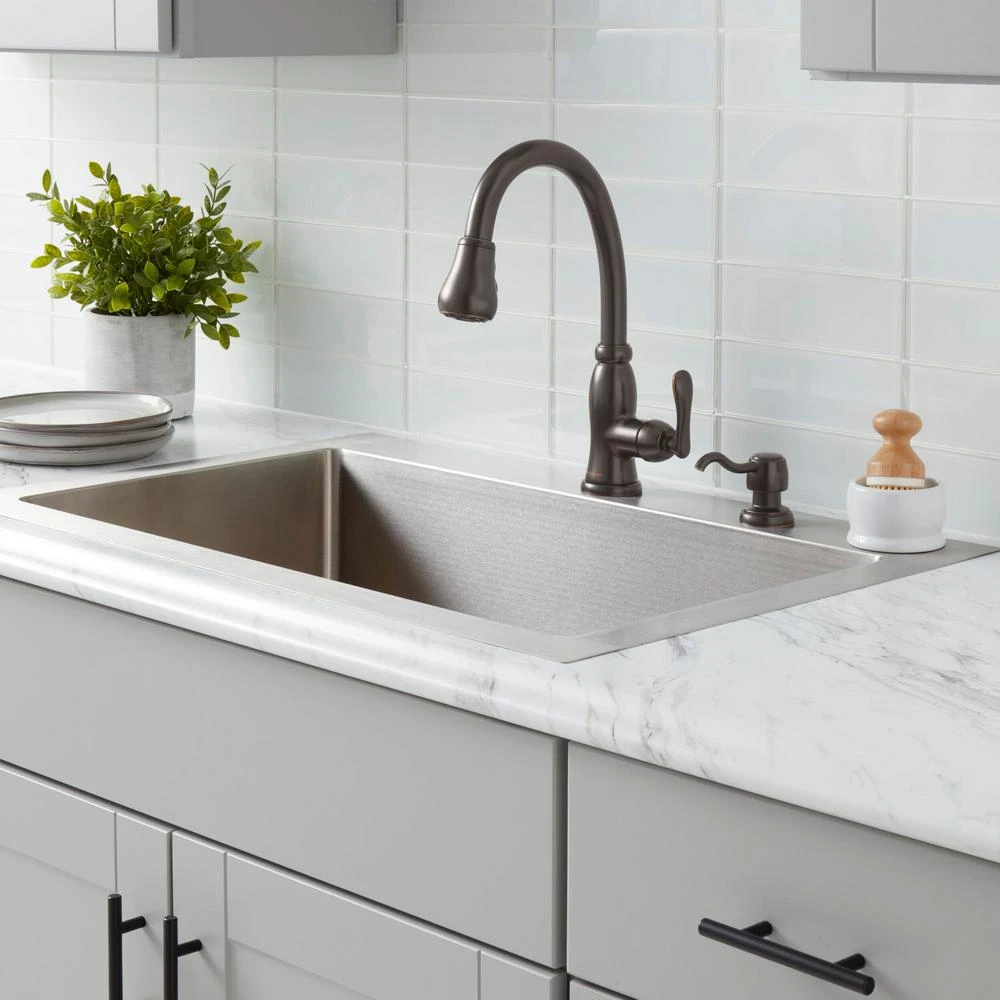 The Glacier Bay Pavilion Single-Handle Pull-Down Sprayer Kitchen Faucet with Soap Dispenser in Bronze has a sleek design to coordinate with a wide variety of kitchen decorating styles. Featuring TurboSpray which provides a stronger spray force than your standard pull-down sprayer. The pull-down spray head offers versatility for both a TurboSpray and aerated spray for completing various washing tasks with efficiency, while the single-handle design makes water control quick and easy. This faucet also includes the Glacier Bay exclusive FastMount installation system to help make installation quicker and easier. For added convenience, it comes with a handy soap/lotion dispenser.