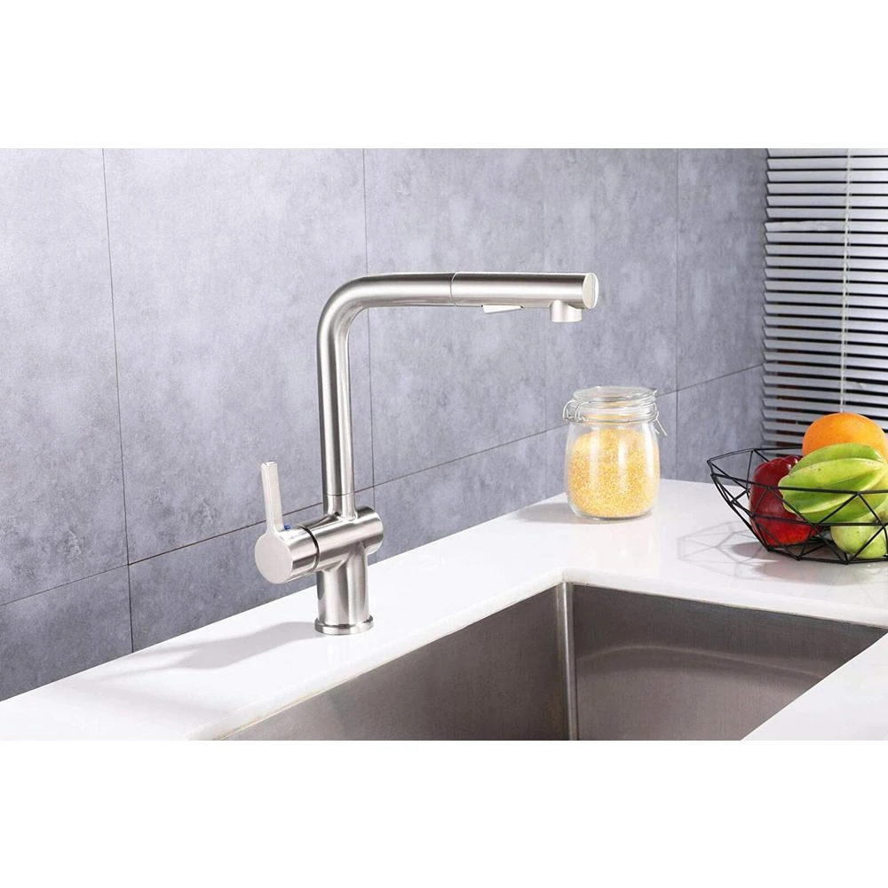This Vanity Art Kitchen Faucet features an elegant design with a classic finish. The faucet comes with a pull-out spout to help extend and thoroughly clean your utensils and tools. Also, its robust brass waterway allows high-pressure water flow with zero internal damage and enhances product longevity.